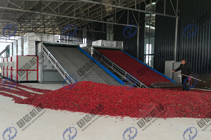 湖南徐總每天烘干辣椒的處理量很大,日烘干量在50噸以上,所以我們給徐總配置的是多層連續(xù)式的大型辣椒烘干機設(shè)備,采用多層網(wǎng)帶烘干方式,因當?shù)丨h(huán)保查的比較嚴,禁止燒煤、燒柴,所以結(jié)合當?shù)丨h(huán)保要求,我們提供的是熱泵空氣能和燃氣兩種烘干方式,這兩種熱源方式都是比較節(jié)能環(huán)保的,可實現(xiàn)辣椒快速烘干產(chǎn)量需求的同時也不會對環(huán)境造成污染和破壞。