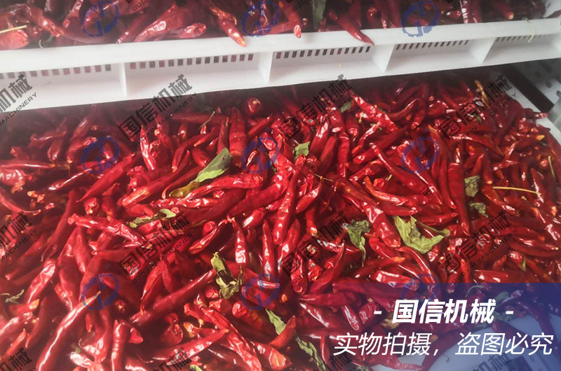 3、二次烘干階段:為保證成品辣椒干貨的品質,此階段需要辣椒鋪料均勻,堆放不可太厚,保證良好的透氣性,設置溫度在60~70℃,時長在6~8個小時即可。