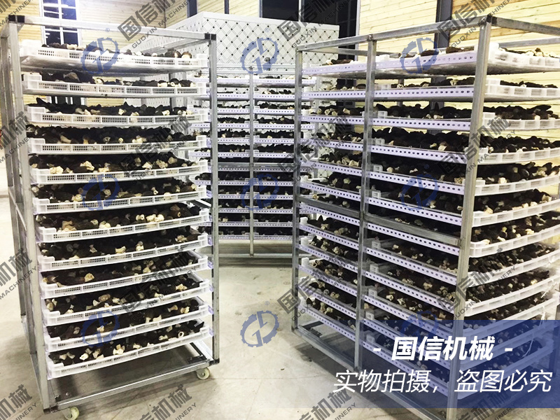 無需冷藏保鮮的羊肚菌按不同長度進行剪柄后,排放于烘篩上,將烘篩推入烘干機烘箱內,緊閉箱門開始啟動機器起烘。起烘溫度不能低于35℃,最好是35℃起烘,濕度控制在70%以內,時間3小時左右,用低溫來給羊肚菌定性定色,以保證其形狀飽滿,不塌陷。