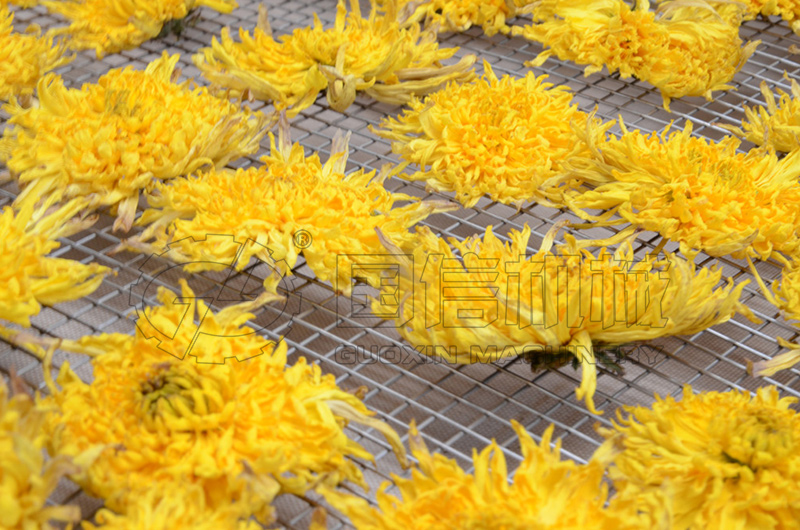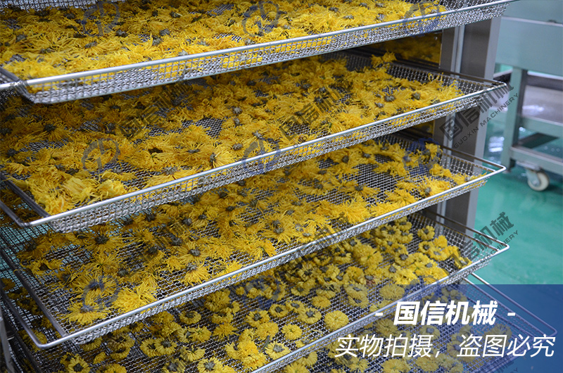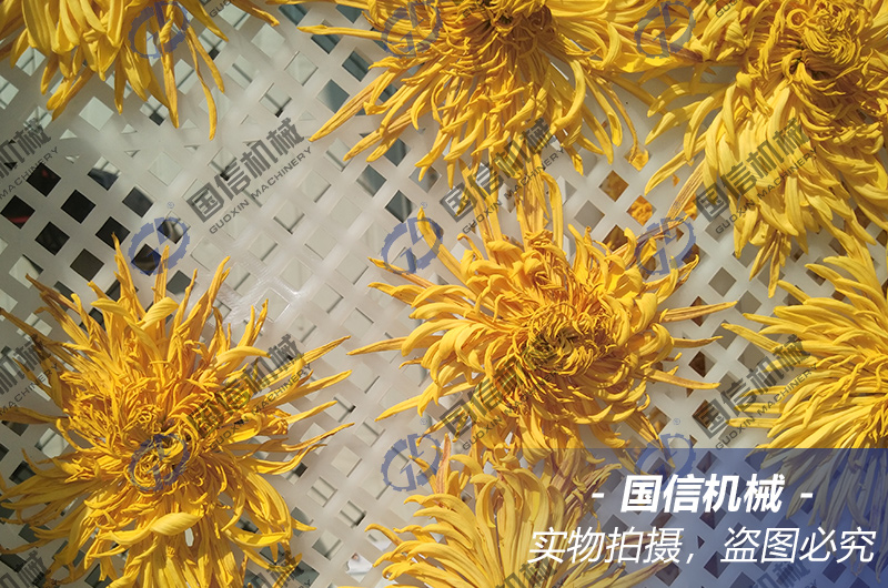 (部分菊花需要殺青階段:設(shè)置溫度65℃~70℃,時長2~3小時,如果需要,可以在進(jìn)料前在鮮菊花上噴灑少量清水,殺青效果更好。)