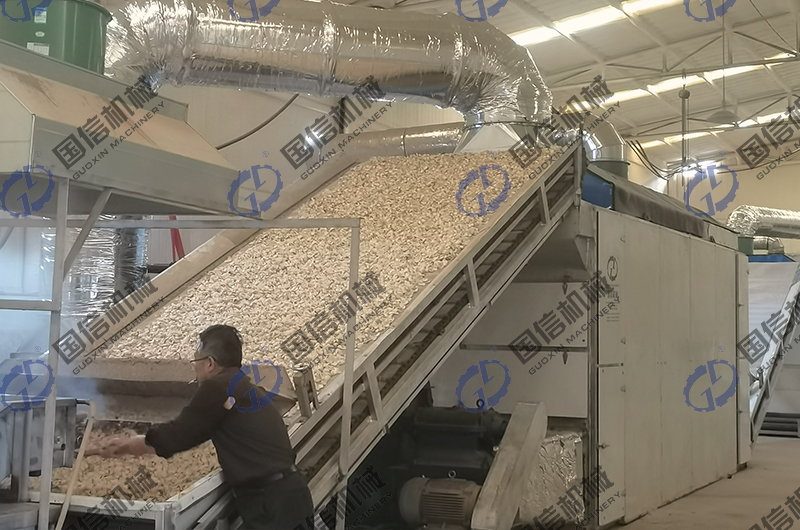冷水漂洗:漂燙好的鱗片立刻投入氣泡清洗機(jī)的冷水中漂洗至冷,瀝干表面的水分。 熱風(fēng)干燥:把瀝干表面水分的鱗片放入料斗內(nèi),經(jīng)自動(dòng)鋪料裝置送入百合烘干機(jī)上上層進(jìn)行干燥,溫度控制在60-70℃,在網(wǎng)帶的帶動(dòng)下,百合鱗片從上層往下層移動(dòng)。運(yùn)行中,百合片受到翻料器的翻動(dòng),同時(shí),百合鱗片有多次往下落的過程,使百合鱗片翻動(dòng)更徹底。最后,干燥至百合鱗片含水量至10%左右(手摸鱗片發(fā)脆為度),干燥好的百合干片從百合烘干機(jī)底層的出料口排出。