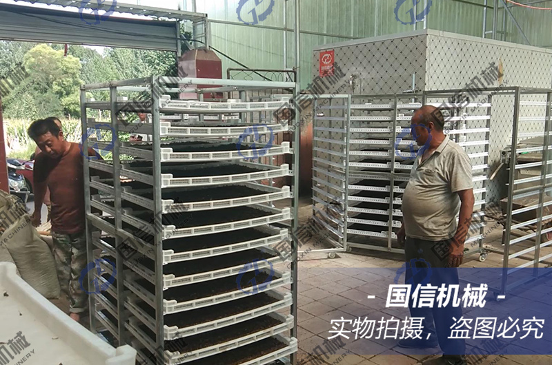 根據連翹烘干種植戶的反饋得出,先將采收的連翹挑選裝盤,建議使用不銹鋼托盤、烘干效率較高,然后推入烘干房。烘干過程的第1~2小時溫度設定60度不排濕,第3~12小時溫度設定55度+排濕功能,這時要根據濕度大小來設定排濕的模式。后期連翹烘干的溫度設定為65度+定時排濕直到完全烘干。這時烘出的連翹干燥均勻,干凈無污染,品相和干燥度達到理想的狀態,非常重要的是連翹及藥用成份得到有效的保存,并且整個烘干過程節能效果顯著,且無任何污染物排放。