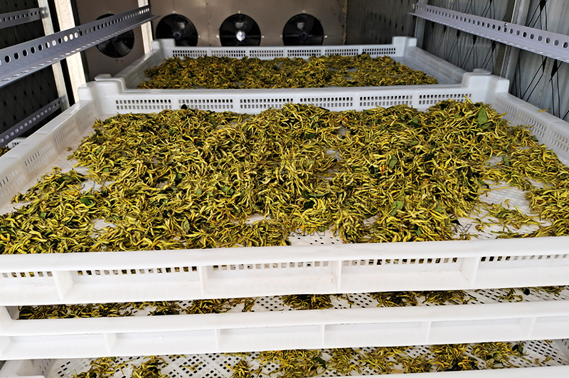 第四階段:強(qiáng)制烘干:溫度范圍為55~65攝氏度,溫度不得超過70攝氏度的高溫,適當(dāng)?shù)慕档团艥袼俣龋?jīng)過2~4小時(shí)的強(qiáng)制烘干,在觀察孔觀察金銀花的烘干成色后可以停機(jī)出爐。